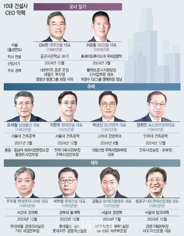 2005년 입사해 GS건설에서 꾸준히 경영수업을 받아온 허윤홍 대표는 2023년 말 CEO 자리에 오른 뒤 지난해 3월 대표로 공식 선임됐다. 허창수 GS그룹 명예회장의 장남이다. GS건설에서 플랜트 관련 부서를 거쳐 신사업부문에 몸담았으며 올해 아파트 브랜드 ‘자이(xi)’ 리브랜딩에 초점을 맞춰 책임경영을 펼칠 전망이다. 허 대표는 1979년생 ‘젊은피’로도 이목을 끈다. 올해 10대 건설사를 이끌 CEO 가운데 가장 젊은 나이로, 이외에도 1970년생으로 이한우 대표와 김형근 대표가 젊은 피에 속한다.