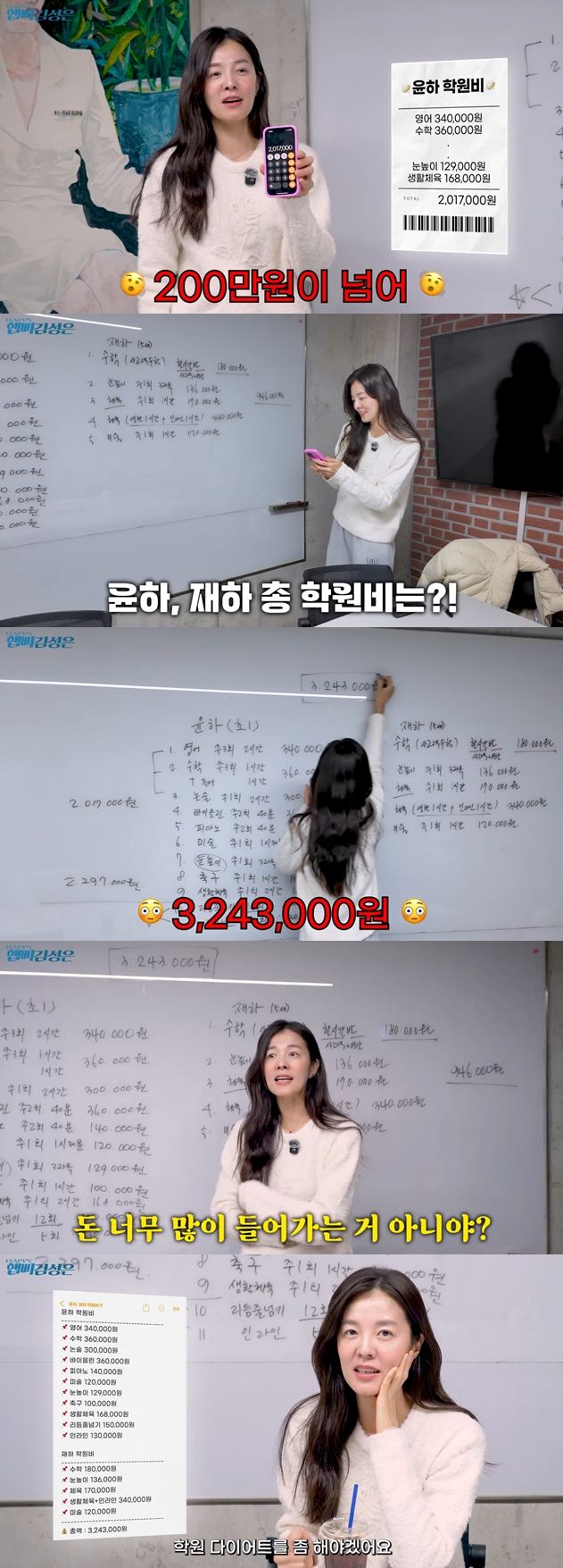 (엑스포츠뉴스 윤현지 기자) 배우 김성은이 자녀 학원비를 공개했다.