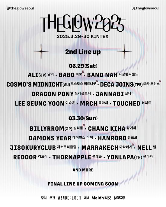 '더 글로우 2025' 관계자는 "라인업은 총 세 번에 걸쳐 발표하며, 이번 2차 라인업 발표를 통해 전체 출연팀의 약 75%가 공개됐다"라고 말했다.