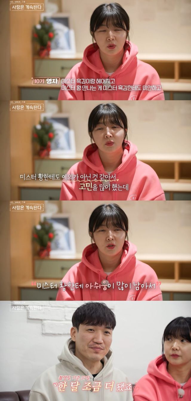 그러면서 영자는 "미스터 흑김이랑 헤어지고 미스터 황 만나는 게 미스터 흑김한테도 미안하고, 미스터 황한테도 예의가 아닌 것 같아서 고민을 많이 했다. 미스터 황한테 아쉬움이 많이 남았다"고 속마음을 털어놓았다.