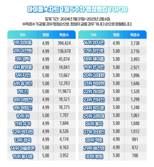 아이돌차트에 따르면 지난 1월 31일부터 2월 6일까지 집계된 평점랭킹에서 임영웅은 39만 4424표를 얻어 최다득표를 기록했다.