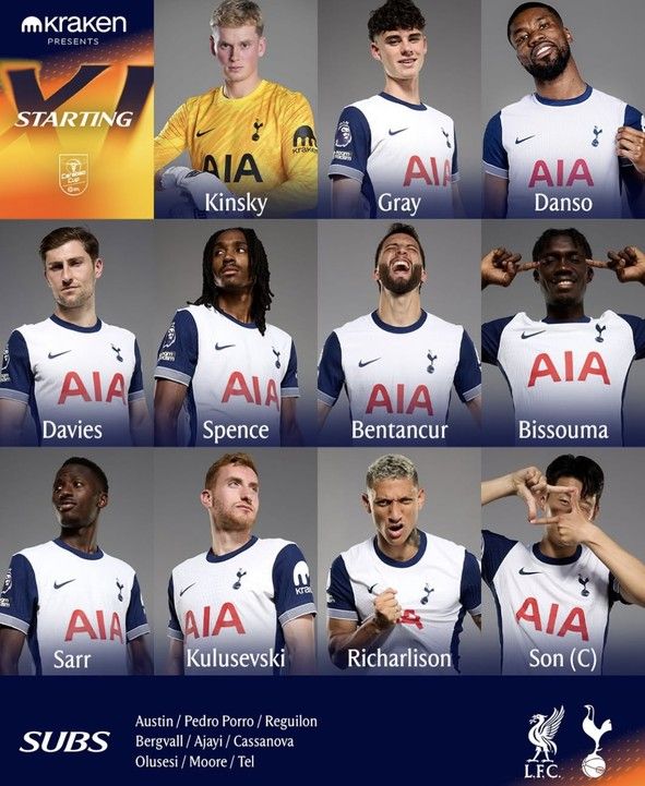 골문은 안토닌 킨스키가 지켰다. 3선은 제드 스펜스, 벤 데이비스, 케빈 단소, 아치 그레이가 지켰다. 2선은 로드리고 벤탄쿠르, 파페 마타르 사르, 이브 비수마가 나섰다. 1선은 손흥민, 히샬리송, 데얀 쿨루셉스키가 출격했다.