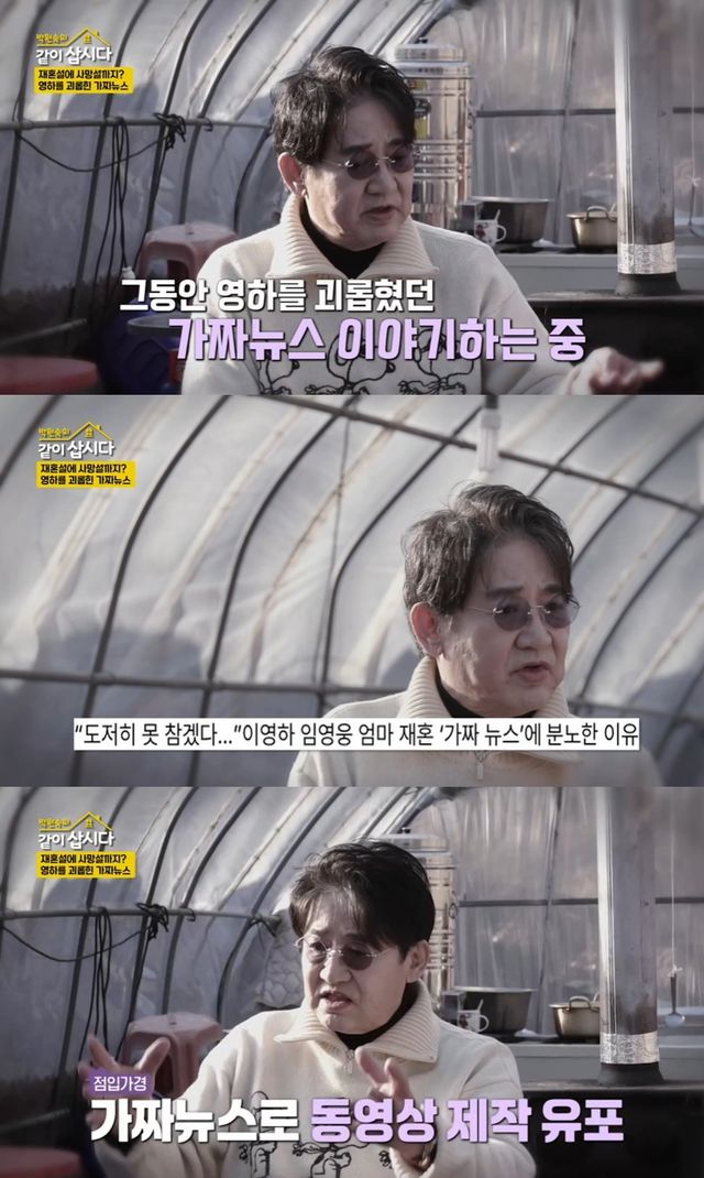 이어 "대한민국에서 제일 유명한 가수의 엄마가 이영하와 결혼을 했다"는 가짜뉴스도 나왔는데, 심지어 결혼식장에서 손 잡고 입장하는 듯한 모습의 동영상까지 만들어 유포하기도 했다며 가짜뉴스로 인한 고통을 호소했다. 그는 지난 2023년 가수 임영웅의 친모와 재혼설이 불거진 바 있다.