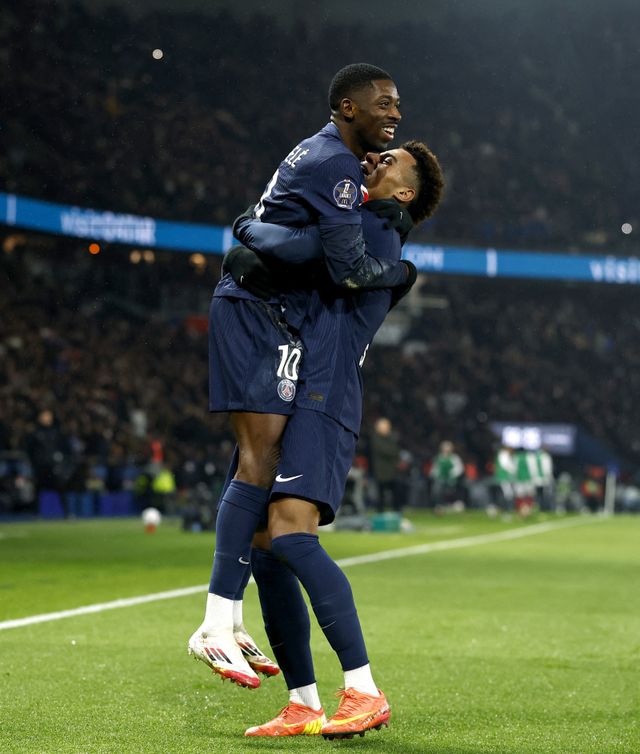 파리 생제르맹(PSG) 우스만 뎀벨레(왼쪽) 8일 프랑스 파리의 파르크 데 프랭스에서 열린 2024~25 프랑스 프로축구 리그1 21라운드 AS모나코전에서 골을 터뜨린 뒤 기뻐하고 있다. 로이터=연합뉴스