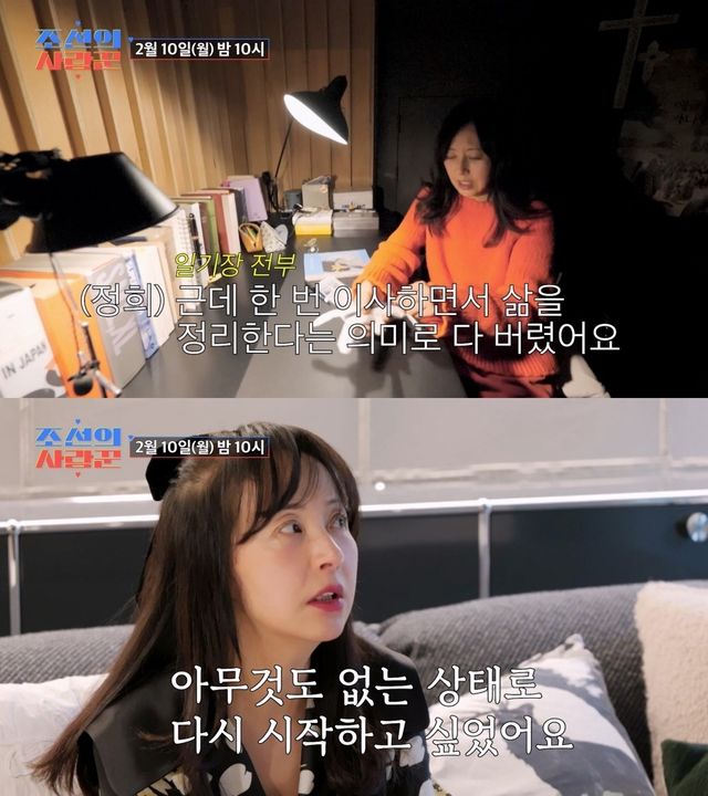 10일 방송될 TV조선 '조선의 사랑꾼'에서는 6세 연하 건축가 남자친구와 함께 새로운 사랑꾼으로 합류를 예고한 서정희가 등장, "(일기장 전부를) 한번 이사하면서 삶을 정리한다는 의미로 다 버렸다"라고 조심스럽게 고백했다.