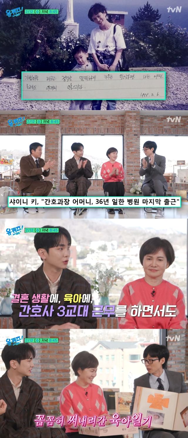 이날 키는 "결혼 생활에 육아를 하면서 간호사로 3교대 근무를 하셨다"고 어머니에 대한 존경심을 표했고, 그렇게 바쁜 와중에도 키가 태어난 1991년부터 최근가지 꼼꼼하게 작성한 육아일기를 본 유재석은 깜짝 놀랐다.