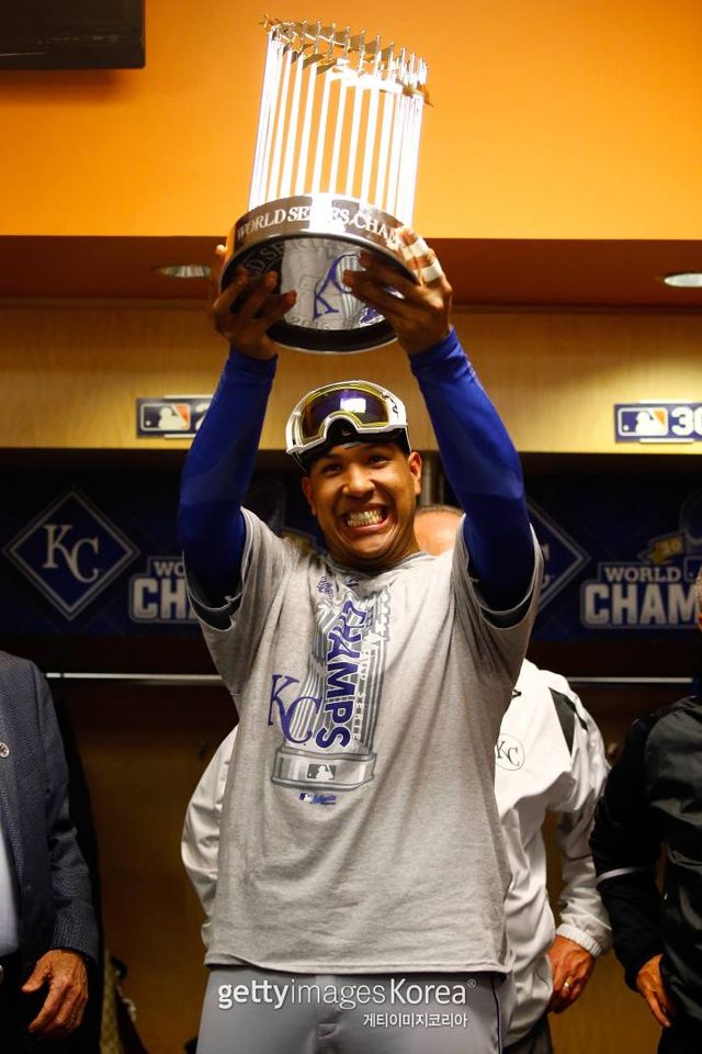 2015년 월드시리즈 우승 트로피를 들어올리는 살바도르 페레스. 게티이미지