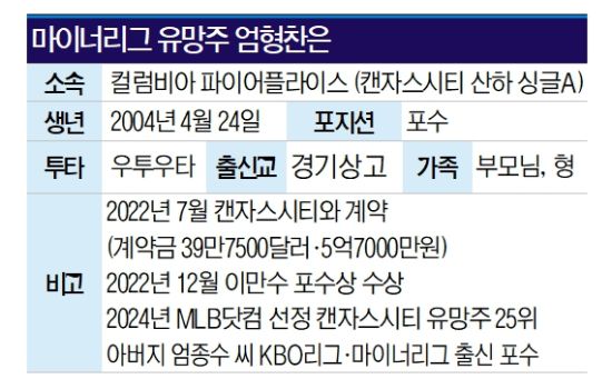한국인 최초로 메이저리그(MLB) 벽을 허문 건 1994년 박찬호이다. 이후 지난 시즌 이정후(샌프란시스코 자이언츠)까지 총 27명의 '코리안 메이저리거'가 탄생했다. 그런데 아직 포수 마스크를 쓰고 빅리그 무대를 밟은 한국인 선수가 없다. 그런 면에서 캔자스시티 로열스 산하 싱글A 소속 엄형찬(21·컬럼비아 파이어플라이스)의 '도전'은 눈여겨볼 만하다.