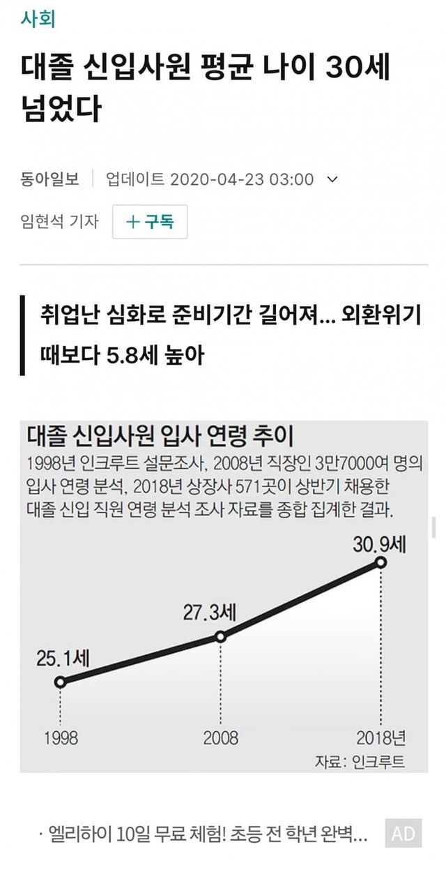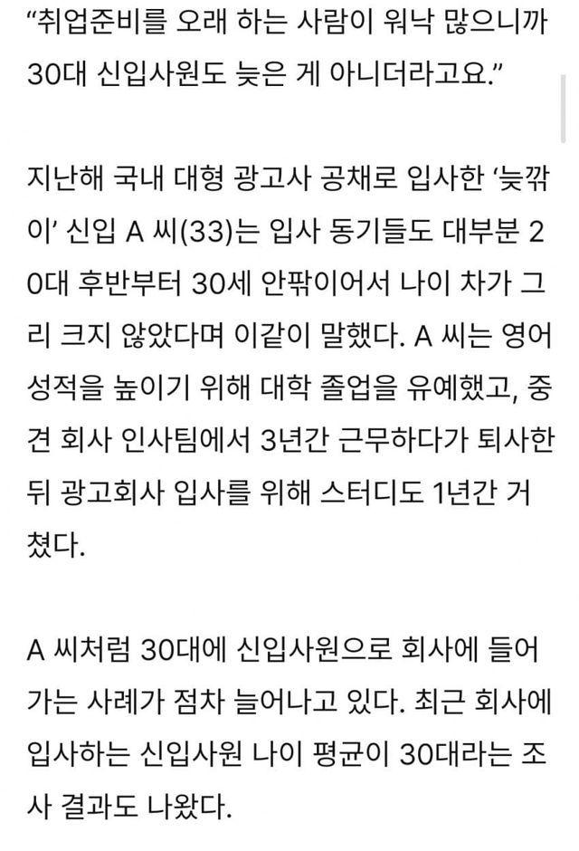 한국은 신입사원 나이가 30을 넘어서 지금 Z세대는 취업조차 못하고 있음
