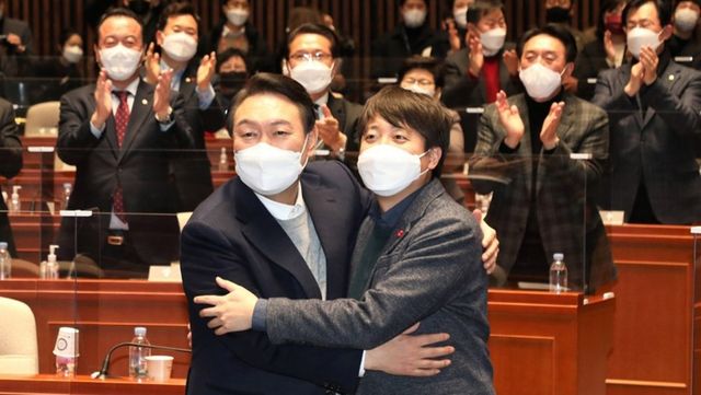 2022년 1월 6일 극적인 화해의 모습을 연출한 이준석 당시 국민의힘대표(오른쪽)와 윤석열 당시 대선 후보./ 뉴스1