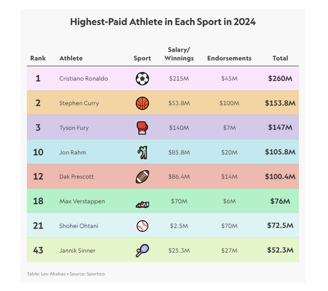 2024년 수입 3위는 1억 4700만 달러(2137억원)의 권투 선수 타이슨 퓨리(영국)가 차지했다. 4~5위는 리오넬 메시(아르헨티나·1962억원)와 르브론 제임스(미국·1936억원)가 이름을 올렸다.