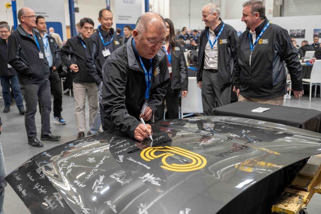 현대차∙기아는 10일(현지 시각) 미국 캘리포니아 캘리포니아시티에 위치한 모하비주행시험장에서 설립 20주년 기념행사를 열고, 완벽한 품질과 성능 확보를 위해 노력해온 연구원들을 치하하는 자리를 마련했다고 13일 밝혔다. 정의선 회장이 행사 참석자들과 함께 기념 사인을 하고 있다. 2025.2.13/뉴스1