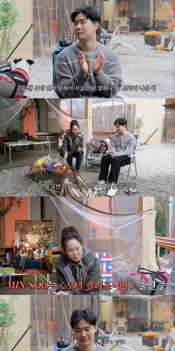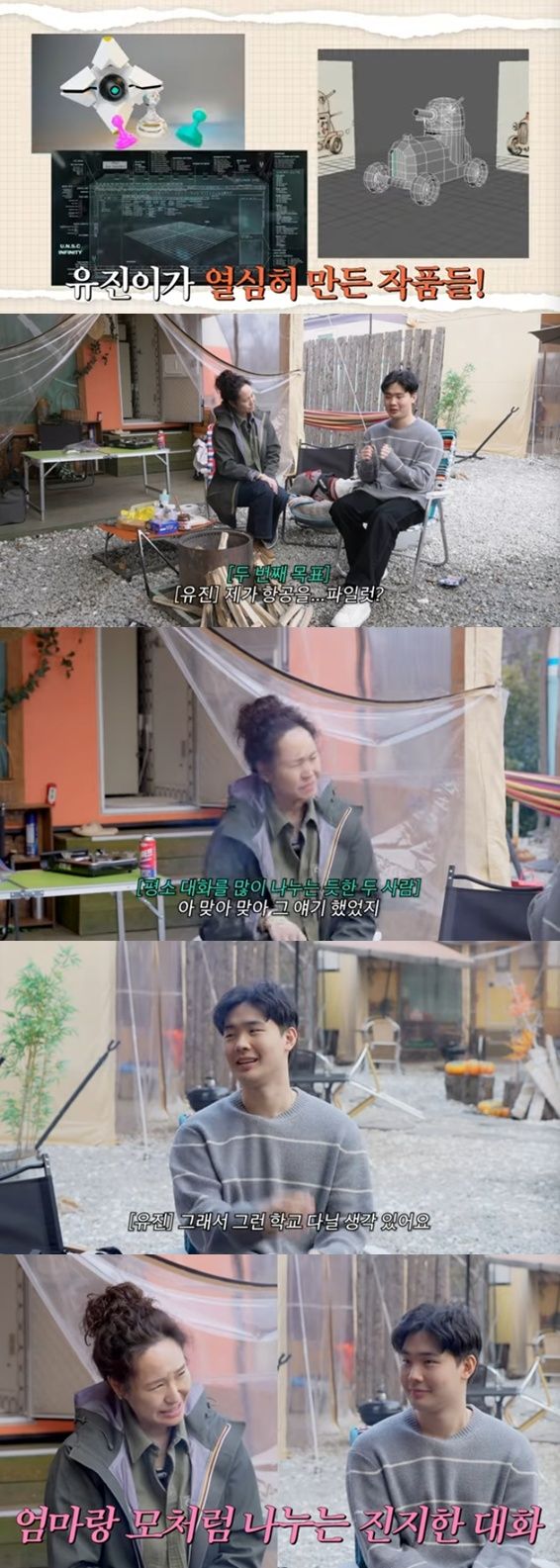 강주은은 "(아들이) 2주 전에 전역했다. 너무 고맙게도 공익 마무리를 잘하고 축하하는 의미로 같이 나오게 됐다. 잭도 같이 왔다. 유진이가 캠핑을 잘한다"라고 이야기했다.