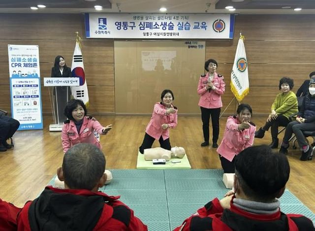 이번 교육은 공원녹지과와 종합민원과 협업으로 영통구 여성지원민방위대가 주관했으며, 일선 현장 근무자가 응급 상황에서 신속하고 올바르게 대처할 수 있도록 심폐소생술(CPR) 및 자동심장충격기(AED) 사용법을 교육하는 동시에 단계별 절차(▲확인 ▲신고 ▲압박 ▲호흡)를 직접 체험할 수 있도록 기획됐다.