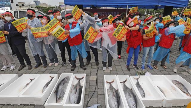 경북 영덕지역 정치망 어업인들이 2022년 8월 8일 오전 서울 용산구 대통령실 앞에서 '참치 어획량 쿼터 폐지 촉구' 집회를 갖고 있다. 당시 어업인들은 매년 참치 쿼터 소진으로 정치망(그물)에 포획된 참다랑어를 판매하지 못하고 바다에 버리는 상황이 수년째 이어지고 있다며 현실적인 대책을 촉구했다. / 뉴스1