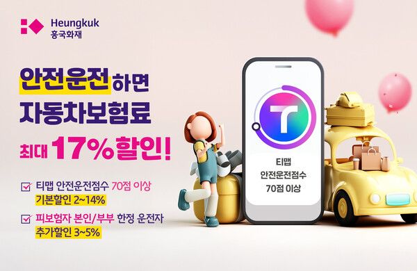 흥국화재는 그동안 티맵(T-MAP) 안전운전점수 95점 이상인 고객에게 보험료를 14% 할인해왔다. 앞으로는 피보험자 본인·부부 한정 운전자에게 3% 추가 할인을 적용하고 최대 17%의 할인을 제공한다.