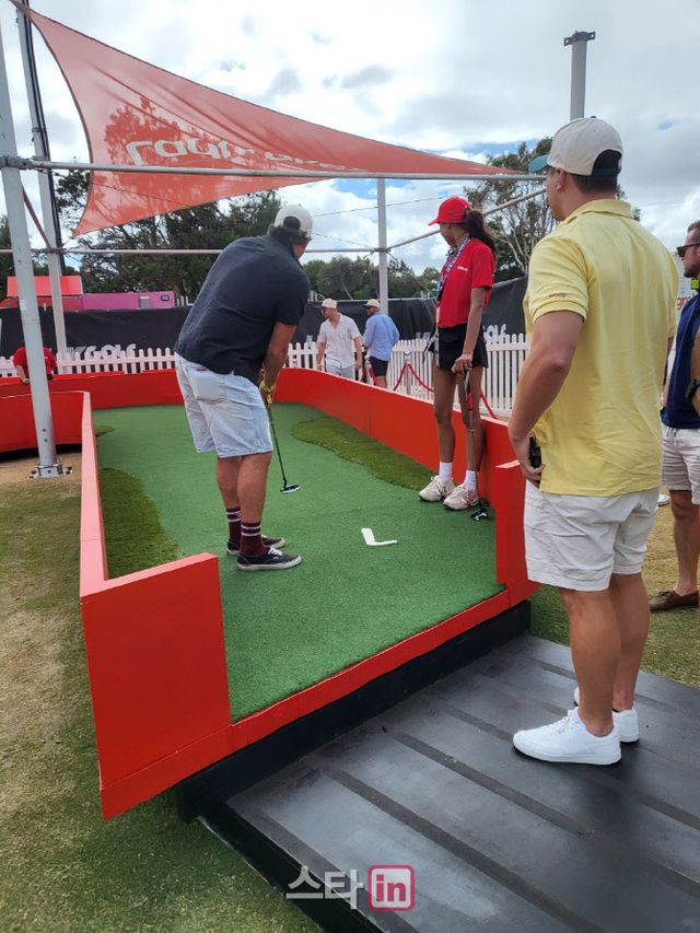 일찌감치 코스를 찾은 이유가 있다. 1번홀에서 18번홀으로 가는 길 중간에 마련한 팬 빌리지에서는 다양한 이벤트가 펼쳐졌다. 호주를 대표하는 서핑이나 크리켓 체험은 물론 페이스 페인팅, 골프 퍼팅 챌린지, 축구 게임을 비롯해 새로 나온 자동차도 전시해 팬들의 발길을 머물게 했다. 이벤트 부스마다 긴 줄이 늘어섰고, 성공하면 마치 자기 일인 것처럼 함께 기뻐하고 환호하는 모습도 인상적이었다.