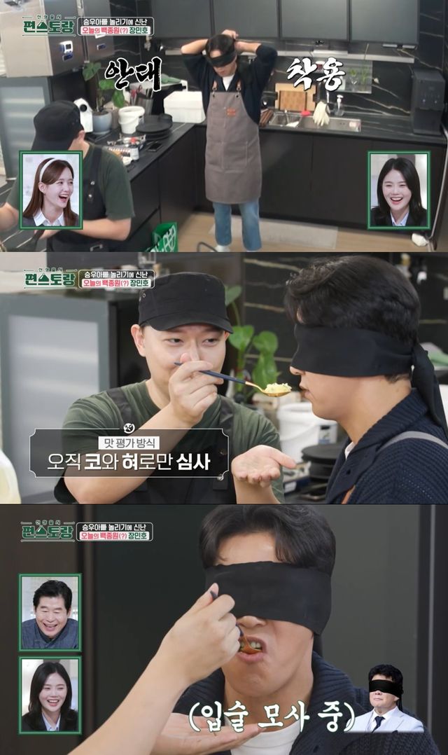 이후 승우아빠는 계란 볶음밥을 선보였고, 장민호는 미리 준비해뒀던 검은 천을 안대처럼 착용해 '흑백요리사'의 백종원으로 빙의해 승우아빠의 음식을 맛 봤다. 특히 장민호는 백종원의 말투를 묘사하는 모습으로 시청자들의 웃음을 유발하기도 했다.