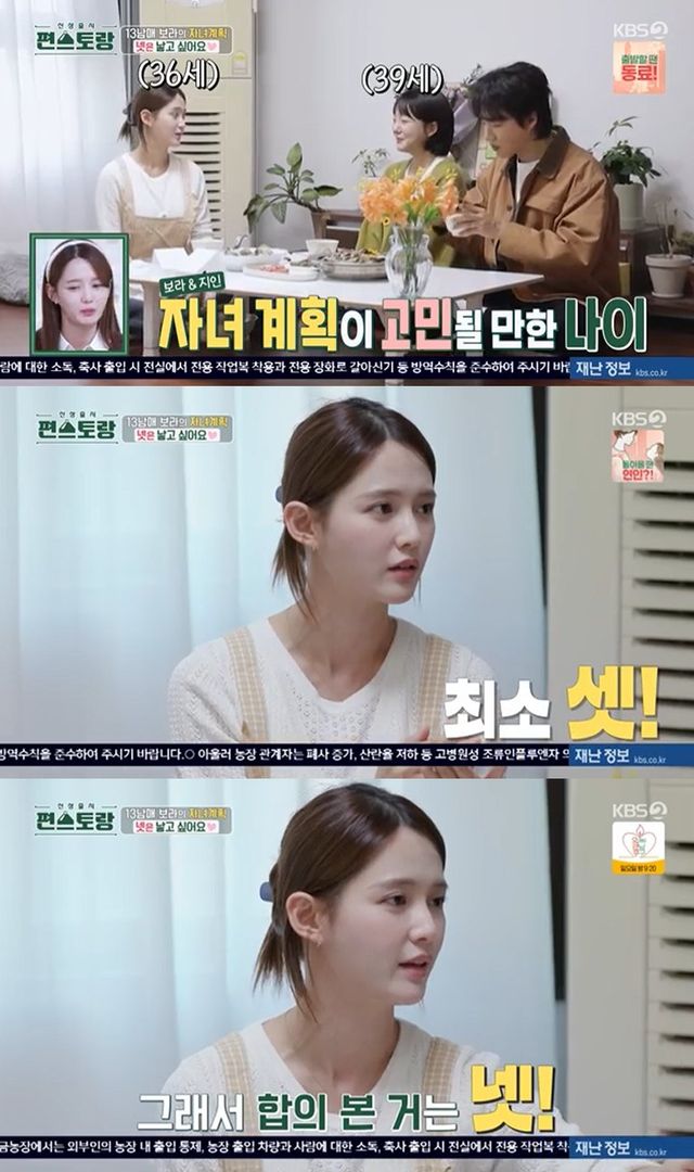 이에 김기리는 "보라는 (아이를) 많이 낳을 계획이니까 뭘 준비하고 있냐"고 물었고, 남보라는 "저희는 체력을 준비하고 있다. 현실적으로 숫자 계산을 해봤을 때 제가 적은 나이가 아니더라. 목표를 이루기 위해서라면 신혼을 포기할 생각도 있다"고 말했다.