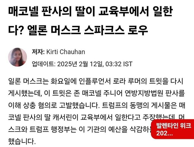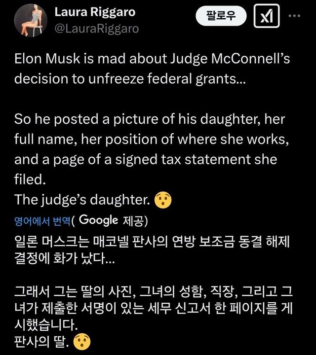 일론 머스크가 연방 정부 지원금 다시 풀어라 판결 낸 판사 본인도 아니고 판사 “딸”을 좌표찍어서 공격함...