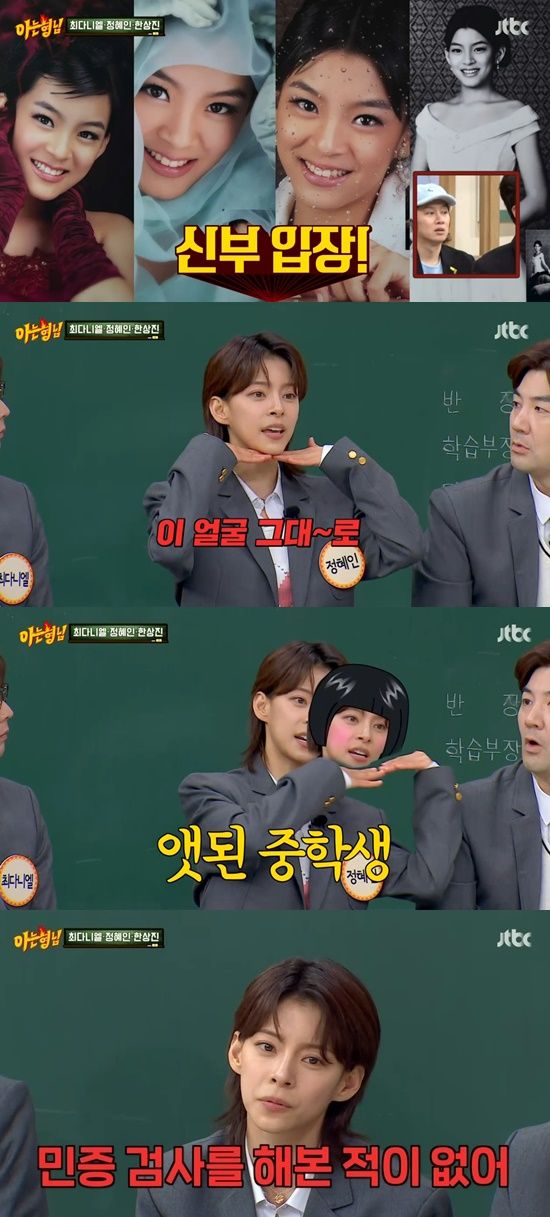 정혜인은 "이 얼굴 그대로 앳된 중학생이었다고 생각하면 된다"며 성숙했던 외모를 인정했고, "9살 차이 나는 동생하고 같이 등교하면 주위에서 저한테 '어머니, 학습지 시키세요' 이런 말을 하시더라. 민증(주민등록증) 검사를 해 본적도 없다"고 설명했다.