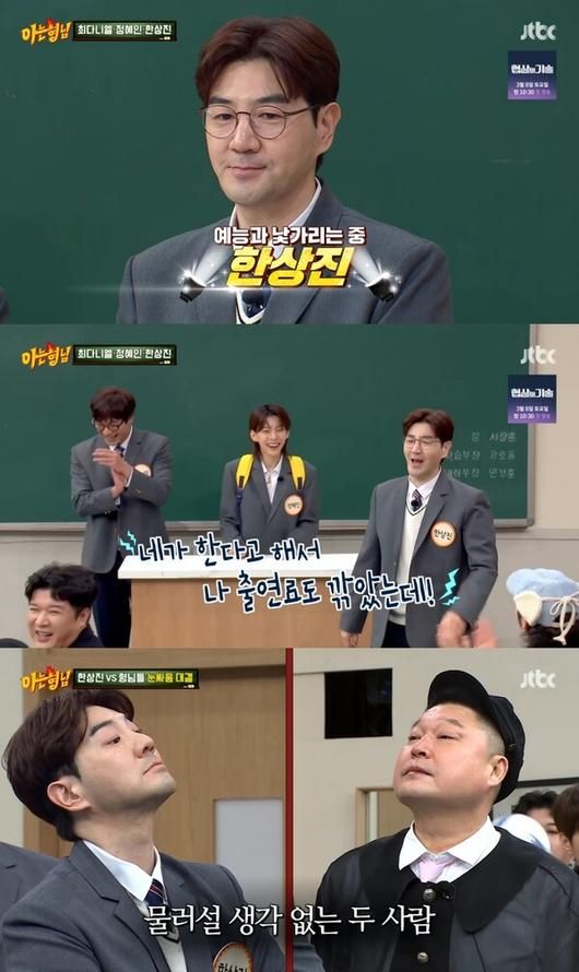 한상진은 지난 15일 방송된 JTBC '아는 형님'에 영화 '써니데이' 주연 배우들과 함께 출연했다. 그는 "아직도 예능만 나오면 어색한 배우 한상진이다"라고 자신을 소개하며 교단에 섰지만, 이수근의 "상진이는 체했냐"라는 지적에 발끈하며 최다니엘, 정혜인에게 "기세에 밀리지 마"라고 외치는 모습으로 시작부터 웃음을 안겼다.