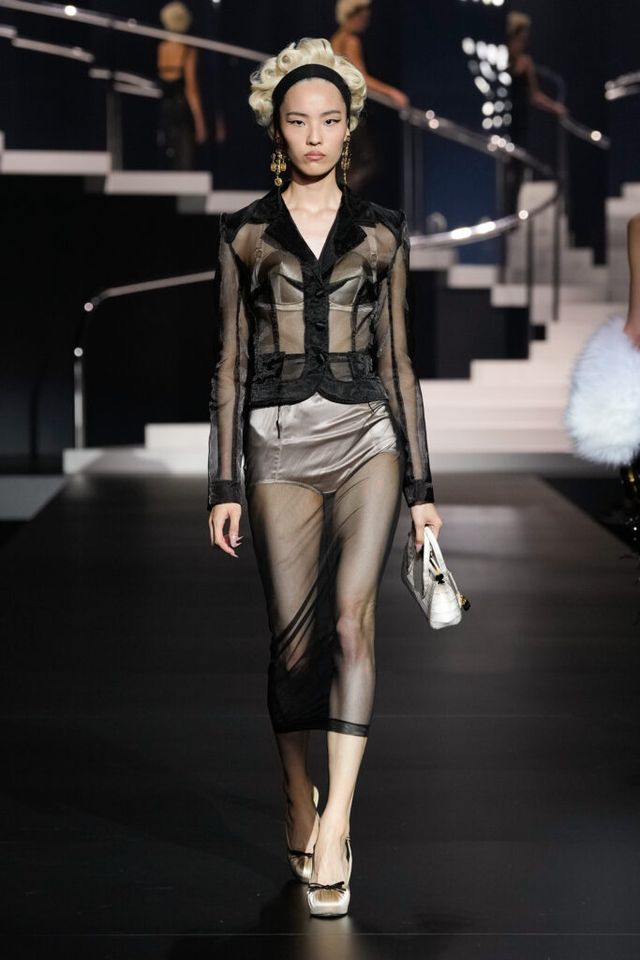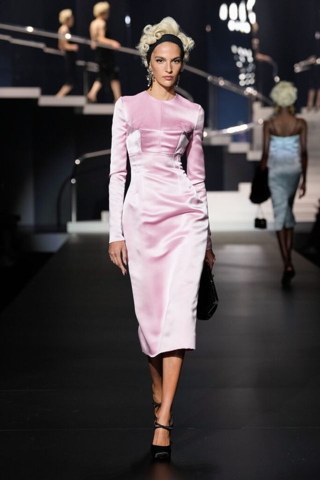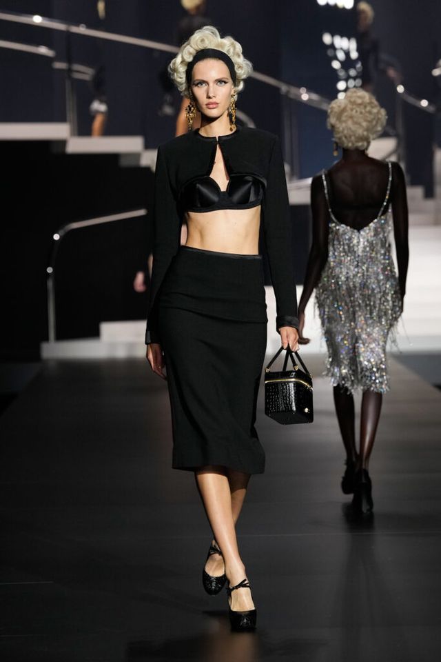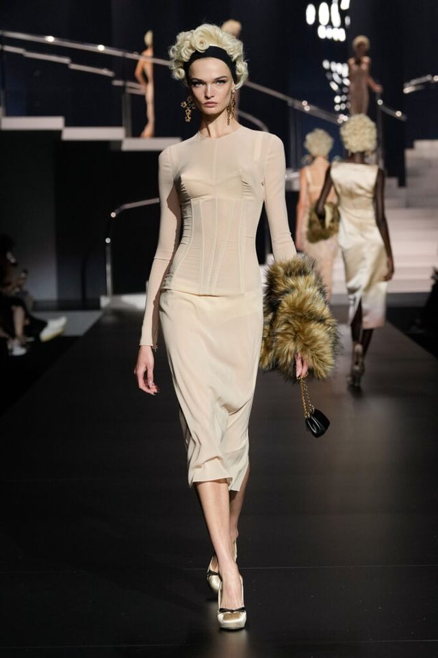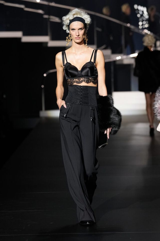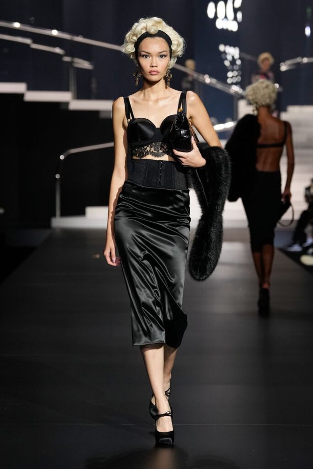 NOTE 돌체앤가바나는 영화 역사에 나타난 다양한 여성상을 하우스만의 스타일로 재해석했다. 이를 위해 드라마틱한 금발 가발, 고전영화에 등장할 법한 시대적인 옷과 코르셋 드레스, 1980년대 배우들이 즐겨 들던 코스메틱 백 등이 하우스만의 코드로 변주돼 런웨이에 올랐다. 란제리 룩의 반복된 등장은 필요 이상으로 외설적이라는 인상을 남기며 아쉬움을 자아냈지만, 섬세한 디테일과 정교한 테일러링은 ‘이탤리언 글램 룩의 정수’라는 표현이 아깝지 않을 정도로 완성도 높았다.