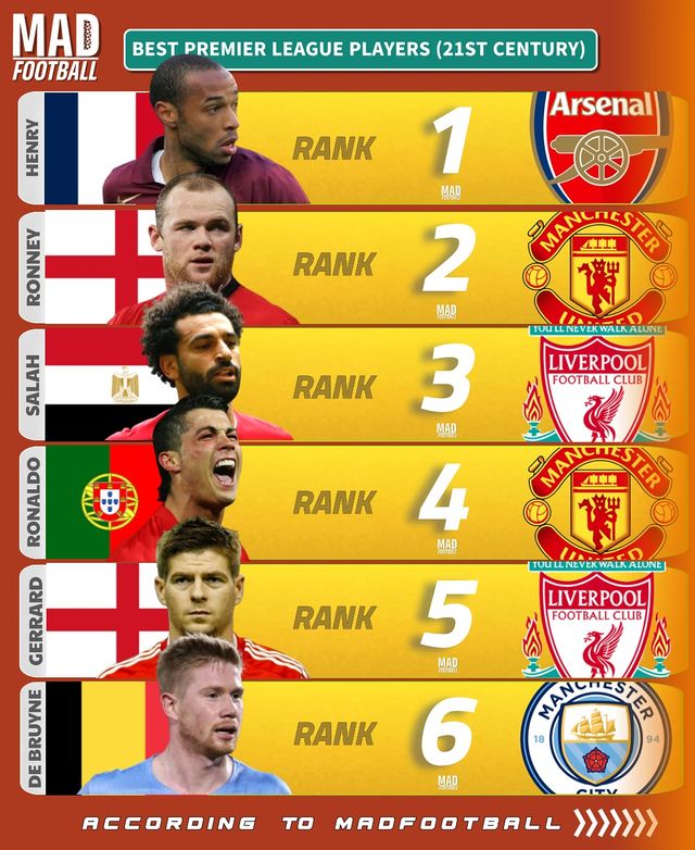 손흥민의 환상의 짝궁 해리 케인(바이에른 뮌헨)이 8위에 자리해 레전드들과 어깨를 나란히 했다. 5위는 스티븐 제라드(리버풀), 4위는 크리스티아누 호날두(맨체스터 유나이티드), 3위는 모하메드 살라(리버풀), 2위는 웨인 루니(맨체스터 유나이티드), 1위는 티에리 앙리(아스널)가 선정됐다.