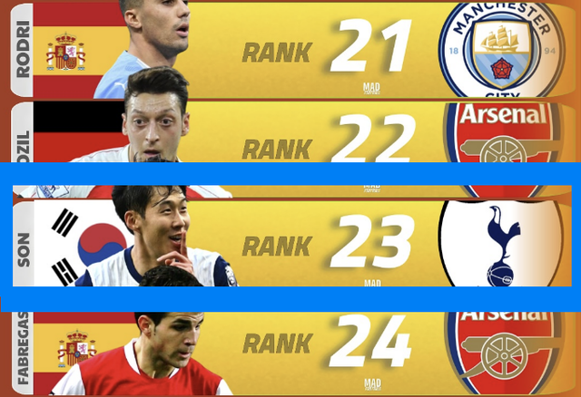 한편 손흥민보다 낮은 순위에는 세스크 파브레가스(아스널)가 이름을 올렸다. 그의 위로는 메수트 외질(아스널), 로드리(맨체스터 시티), 패트릭 비에이라(아스널), 에당 아자르(첼시) 등이 이름을 올렸다.
