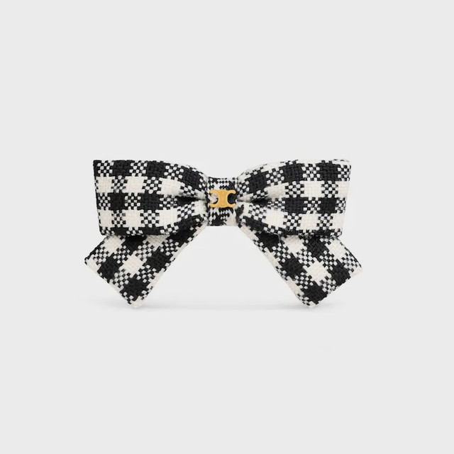 비쉬 리본 헤어 클립은 블랙 체크 패턴과 중앙에 자리 잡은 금색 트리옹프 로고가 특징입니다. 로맨틱한 원피스 룩에 더하면 파리지엔 무드를 한층 업그레이드해 줄 아이템이에요.