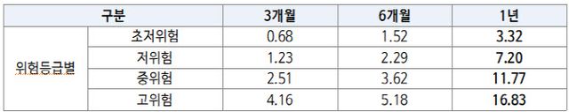위험등급별 연간 수익률은 초저위험 3.32%, 저위험 7.20%, 중위험 11.77%, 고위험 16.83%를 기록했다. 위험등급별 연간 최고 수익률은 초저위험 4.01%, 저위험 15.83%, 중위험 20.89%, 고위험 35.88%였다.
