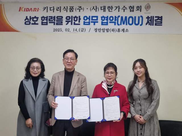 대한가수협회는 전국 7개 고속도로 휴게소를 운영하는 식품 전문 기업 키다리식품(주)와 MOU를 체결했다. 지난 14일 ‘정안 알밤 휴게소’에서 열린 MOU 협약식에는 대한가수협회 이자연 회장과 ‘차세대 트로트 퀸’ 진혜진이, 키다리식품(주)에서는 이명수 회장과 이경애 총괄 부대표, 김종찬 고문 등이 참석했다. 키다리식품(주)는 1992년 식품회사로 창립, 전국 7개 휴게소를 운영하고 있는 대전의 대표 중견기업이다.