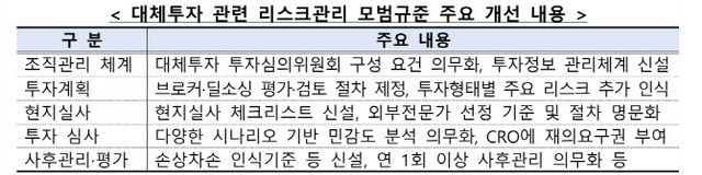 사후관리 및 평가 단계에서는 부실(우려) 자산을 평가하기 위한 자산건전성 분류 및 손상차손 인식 기준을 신설했다. 연 1회 이상 투자자산의 사후관리를 의무적으로 실시하고, 부실발생 가능성이 높다고 판단되는 자산은 수시로 점검하도록 했다.