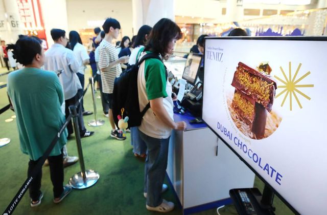 숏폼을 타고 유행 중인 두바이 초콜릿이 '품귀 대란'을 겪고 있는 가운데 2024년 7월 21일 오전 서올 송파구 롯데월드몰 '테미즈' 팝업 스토어에서 시민들이 '두바이 초콜릿'을 구매하기 위해 줄지어 기다리고 있다 / 뉴스1