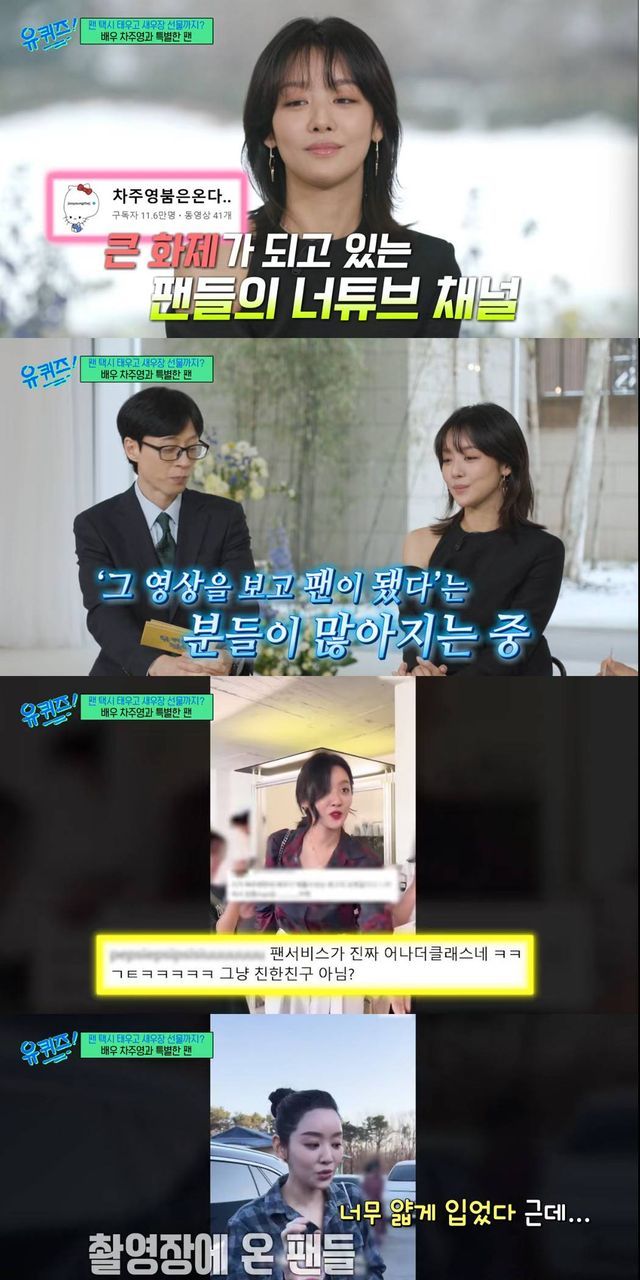 이날 방송에는 최근 화제를 모은 차주영과 팬들의 케미 영상이 언급됐다. '차주영 붐은 온다'는 채널을 언급한 유재석은 "영상을 보고 팬됐다는 얘기가 많다"고 했다. 이어 "차기작 소식도 먼저 알려주고 촬영장에 온 팬들을 택시태워 보내주고"라고 이야기했다. 해당 영상의 조회수는 1010만이 넘었다.