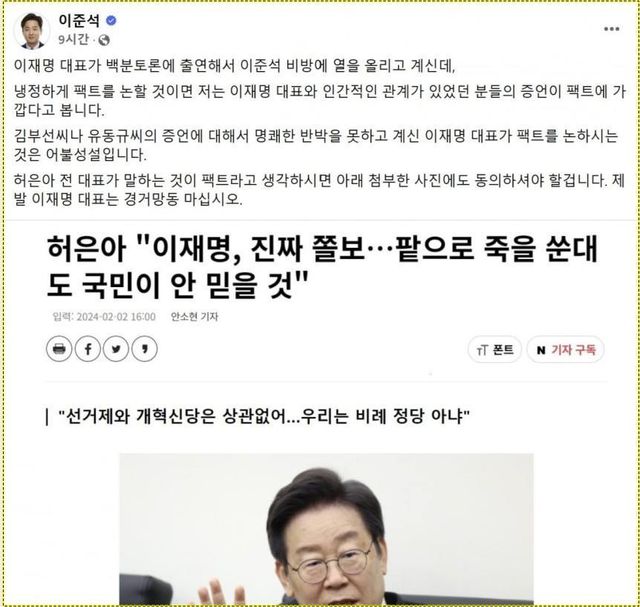 이 대표의 발언을 접한 이 의원은 즉각 반응했다. 그는 자신의 SNS를 통해 "이 대표가 '100분토론'에서 저를 비방하는 데 열을 올렸다"며 "허 전 대표의 발언이 사실이라고 생각한다면, 1년 전 허 전 대표가 한 발언도 사실이라고 인정해야 하지 않겠느냐"고 반박했다.