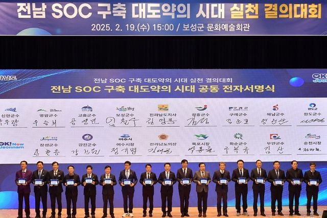 [파이낸셜경제=김영란 기자] 정기명 여수시장이 19일 보성 문화예술회관에서 열린 ‘전남 SOC 구축 대도약의 시대 실천 결의대회’에 참석해 도내 16개 시군의 사회기반시설 사업이 국가계획에 반영될 수 있도록 뜻을 모았다.