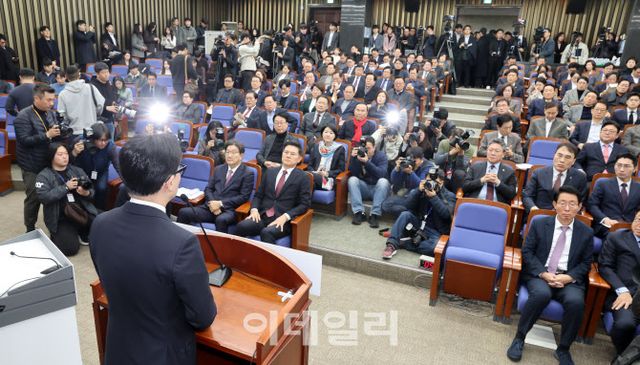 [이데일리 방인권 기자] 한동훈 국민의힘 대표가 12일 서울 여의도 국회에서 열린 2024 국민의힘 원내대표 선출 의원총회에서 발언을 하고 있다.