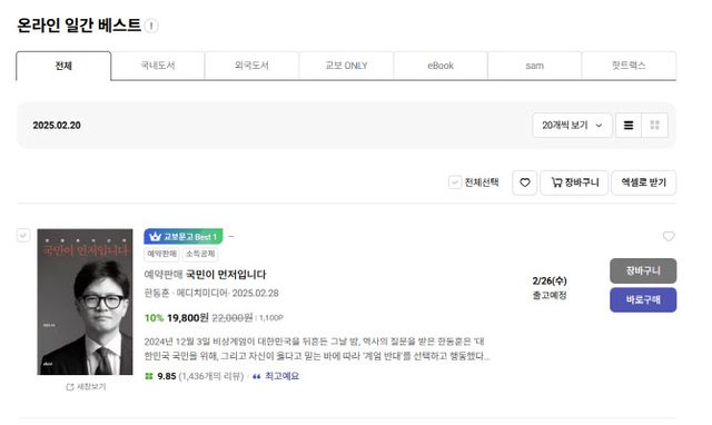 국내 최대 도서기업인 교보문고의 20일 집계에 따르면, 한 전 대표의 저서 ‘국민이 먼저입니다’(메디치미디어)는 국내 도서부문 온라인 일간베스트 1위에 올랐습니다. 한 전 대표의 저서는 지난 19일 예약 판매와 동시에 주요 서점에서 실시간 판매 1위에 오르며 순위 경쟁을 벌이고 있습니다.