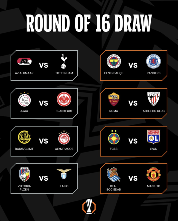 토트넘과 함께 리그에서 부진 중인 맨유는 레알소시에다드와 16강에서 맞붙게됐다. 소시에다드는 미트윌란과 16강 플레이오프에서 합산 7-3으로 대승을 거두며 토너먼트에 올랐다. 일본 국가대표 구보 다케후사 스페인 국가대표 미켈 오야르사발 등이 공격을 이끌고 있다.
