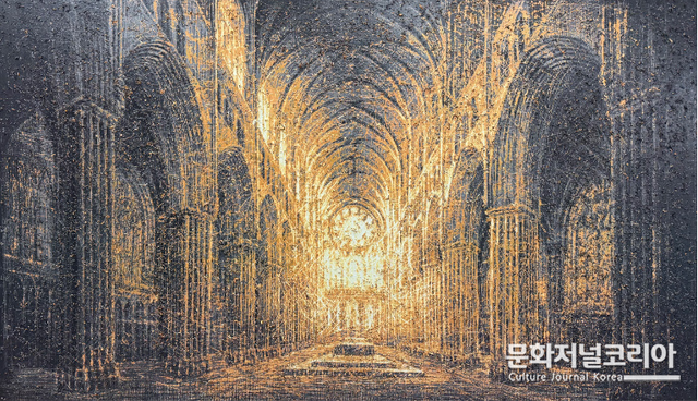 곽수영은 유럽 성당의 고딕 양식에서 영감을 받아 건축과 빛이 만들어내는 공간의 서사를 캔버스 위에 구현한다. 그의 작품은 빛과 그림자의 변화를 섬세하게 포착하며, 시공간의 흐름과 감각을 예술적으로 풀어낸다. 화면 속 명암의 대비는 경건한 예배당의 고요함을 담아내는 동시에, 내면의 깊은 울림과 성찰을 이끌어낸다.