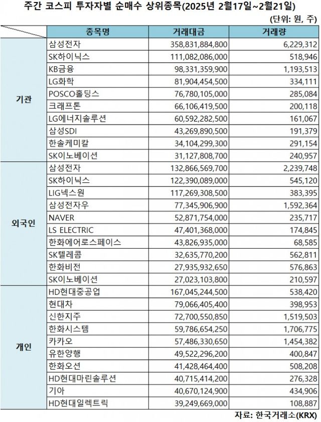 기관 '삼성전자'·외인 '삼성전자'·개인 'HD현대중공업' 1위 [주간 코스피 순매수- 2025년 2월17일~2월21일]