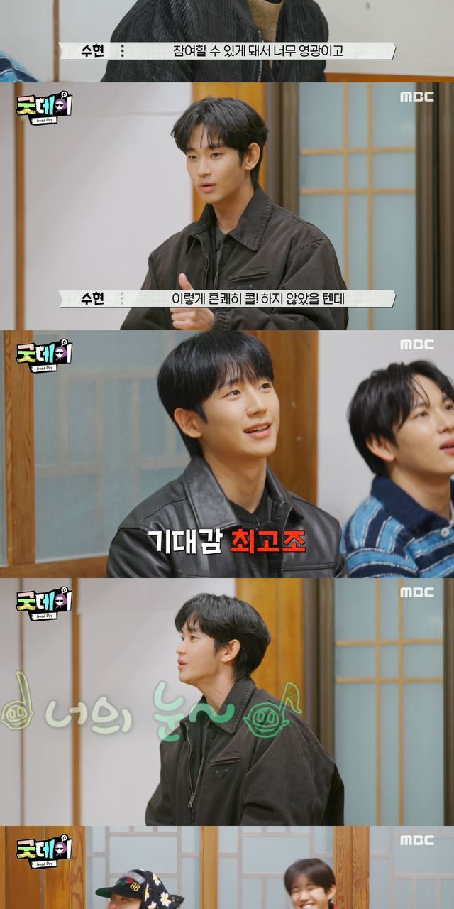 계속해서 지드래곤이 "수현이의 특기는?"이라고 물었고, 김수현은 "노래 하는 거 좋아한다"라고 답했다. 그러면서 김수현은 목을 풀더니 태양 모창을 선보였다. '눈 코 입' 한 소절을 부르다 이내 눈치를 보기 시작, 민망했는지 급 마무리 해 웃음을 자아냈다.
