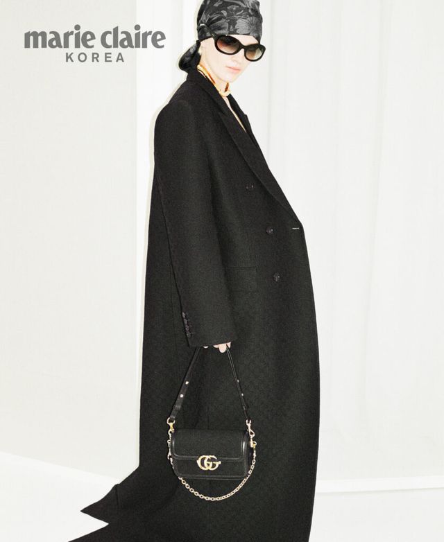 Karolina 블랙 더블브레스트 오버사이즈 코트, 탱크톱, 코튼 데님 팬츠, 두건으로 연출한 실크 스카프, 오버사이즈 선글라스, 뱀부 모티프 골드 네크리스, GG 버클 장식 벨트, GG 모노그램과 잠금 장식이 조화로운 스몰 숄더백, 플랫 부츠 모두