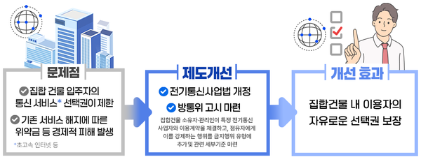 앞서 오피스텔·아파트 등 집합건물 소유자 및 관리인 등이 특정 전기통신사업자와 이용계약을 체결한 후, 입주자에게 해당 서비스 이용을 강제하는 행위를 금지하는 「전기통신사업법」이 개정(’24.1.30.) 됐다.