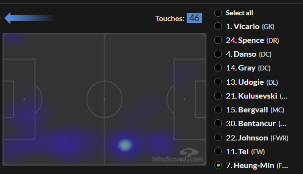 이번 시즌 손흥민은 아크 좌우 '손흥민 존'에서의 골은 물론 슈팅 자체가 적은데 포스테코글루 감독이 손흥민의 득점 재능을 살리지 않고 변칙 기용했음이 이번 히트맵을 통해 드러났다.