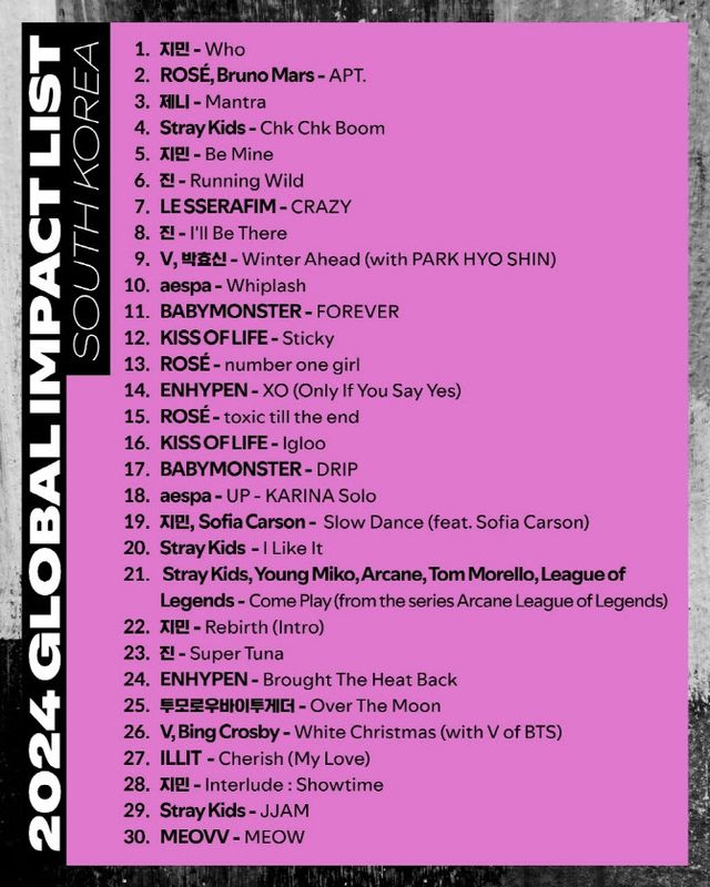 ‘글로벌 임팩트’ 리스트에 가장 많이 포함된 아티스트는 방탄소년단 멤버들이다. 지민의 솔로 활동 5곡 외에도 진의 ‘러닝 와일드’(6위), ‘아윌 비 데어’(8위)와 ‘슈퍼 참치’(23위), 뷔의 ‘윈터 어헤드’(9위), ‘화이트 크리스마스’(26위) 등 총 10곡이 선정돼 지속되는 글로벌 인기를 입증했다.