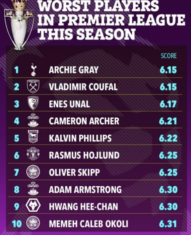 이번 시즌 토트넘으로 이적한 뒤 주전급 선수들의 줄부상으로 센터백과 풀백, 수비형 미드필더 등을 계속 오가는 19세 아치 그레이가 6.15점으로 최악의 선수 1위를 차지했다. 출전시간을 잃은 웨스트햄 수비수 블라디미르 쿠팔이 6.15점으로 2위에 올랐으며 본머스의 튀르키예 국가대표 에네스 우날이 6.17점으로 3위다.
