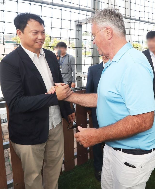 2002년 한일 월드컵 당시 축구대표팀에서 함께 뛴 히딩크 감독을 만난 이운재 코치 / 연합뉴스