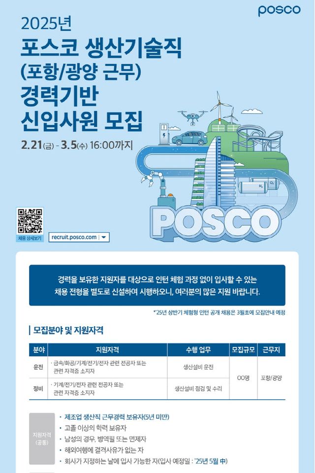 포스코에 따르면 지난달 21일부터 3월 5일까지 포항과 광양에서 근무할 현장 생산기술직 경력기반 신입사원을 모집한다.